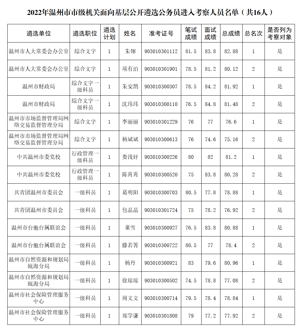 年溫州市市級(jí)機(jī)關(guān)面向基層公開(kāi)遴選公務(wù)員進(jìn)入考察人員名單