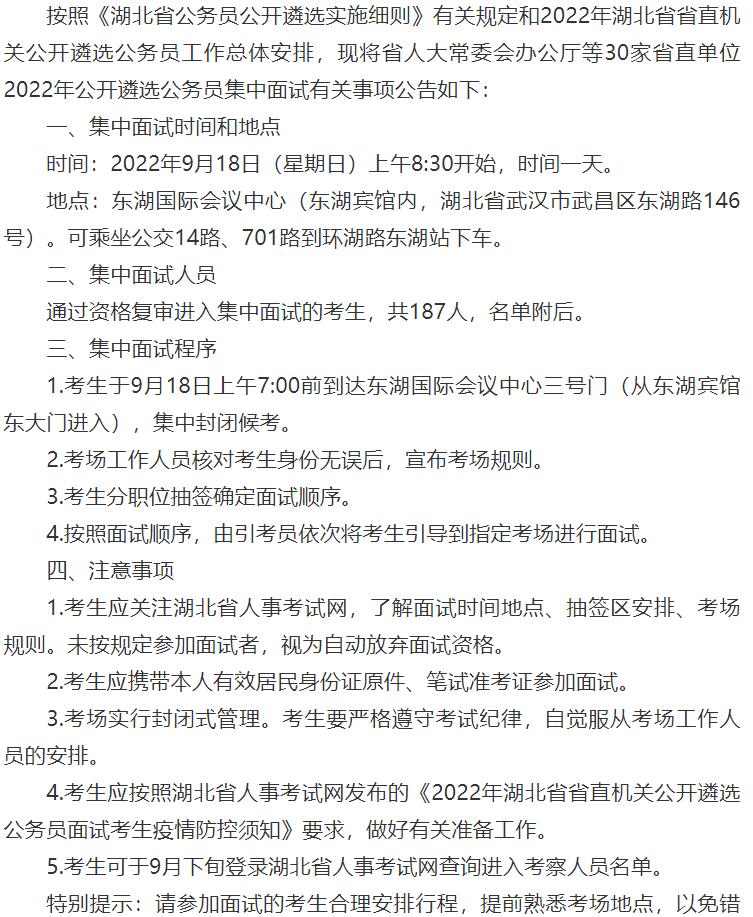 2022年湖北省省直機關(guān)公開遴選公務員集中面試公告