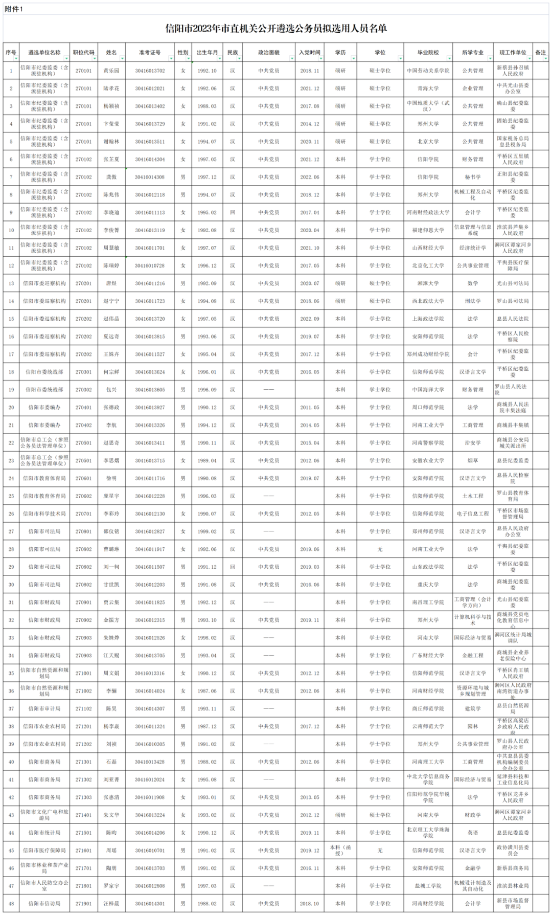 信陽市2023年市直機(jī)關(guān)公開遴選公務(wù)員擬選用人員公示