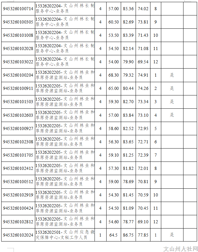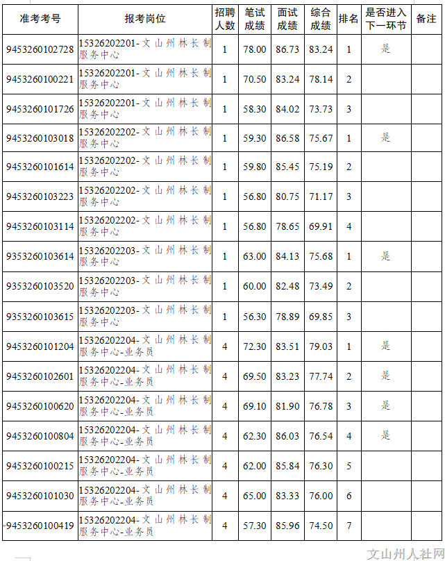 公選王遴選網(wǎng)訊 根據(jù)《2023年文山州州屬事業(yè)單位公開選調(diào)工作人員通告》和《2023年文山州州屬事業(yè)單位公開選調(diào)工作人員筆試成績(jī)及資格復(fù)審有關(guān)事項(xiàng)通告》要求,州林業(yè)和草原局、州應(yīng)急管理局、州文化和旅游局、州三七和中醫(yī)藥產(chǎn)業(yè)發(fā)展中心、州農(nóng)業(yè)科學(xué)院5家單位于2023年7月16日進(jìn)行了面試,現(xiàn)將面試成績(jī)和后續(xù)有關(guān)事項(xiàng)通告如下。