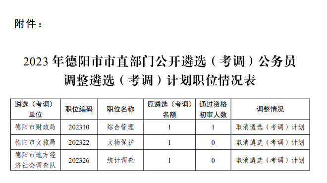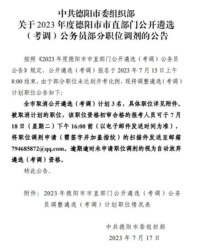 中共德陽市委組織部關(guān)于2023年度德陽市市直部門公開遴選(考調(diào))公務(wù)員部分職位調(diào)劑的公告