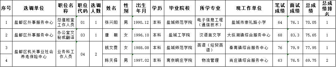 公選王遴選網(wǎng)訊 根據(jù)《鹽都區(qū)2023年部分事業(yè)單位公開選調(diào)工作人員公告》要求,經(jīng)過報名、筆試、面試、體檢、考察等程序,現(xiàn)將擬選調(diào)人員名單公示如下: