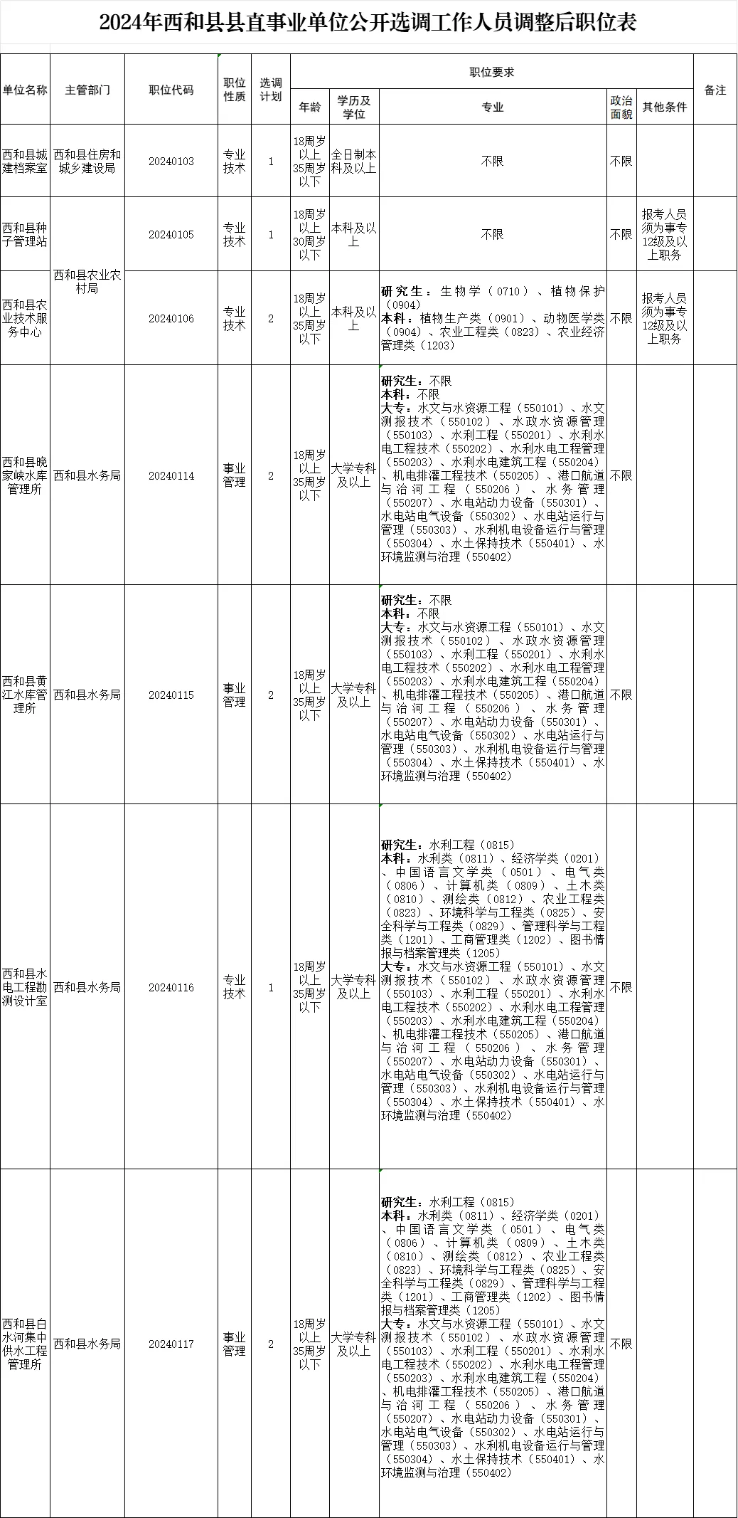 附件:1、2024年西和縣縣直事業(yè)單位公開選調(diào)工作人員調(diào)整后職位表
