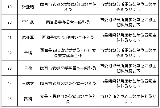 根據(jù)《隴南市2024年度市直機(jī)關(guān)及參照公務(wù)員法管理單位公開遴選公務(wù)員及參照公務(wù)員法管理單位工作人員公告》規(guī)定,經(jīng)報(bào)名、資格審查、筆試、資格復(fù)審、面試、考察、體檢等程序,確定趙剛等25名同志為擬遴選人員(名單見附件),現(xiàn)予以公示,接受廣大干部群眾監(jiān)督。若發(fā)現(xiàn)擬遴選人員有影響遴選的問題,可通過電話、來信、面談等形式反映,我們將認(rèn)真受理,及時(shí)調(diào)查核實(shí)。