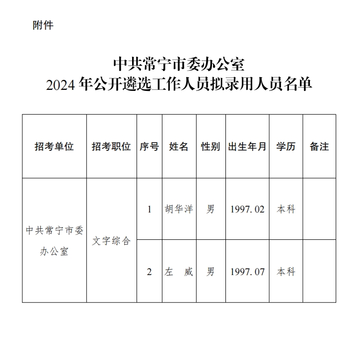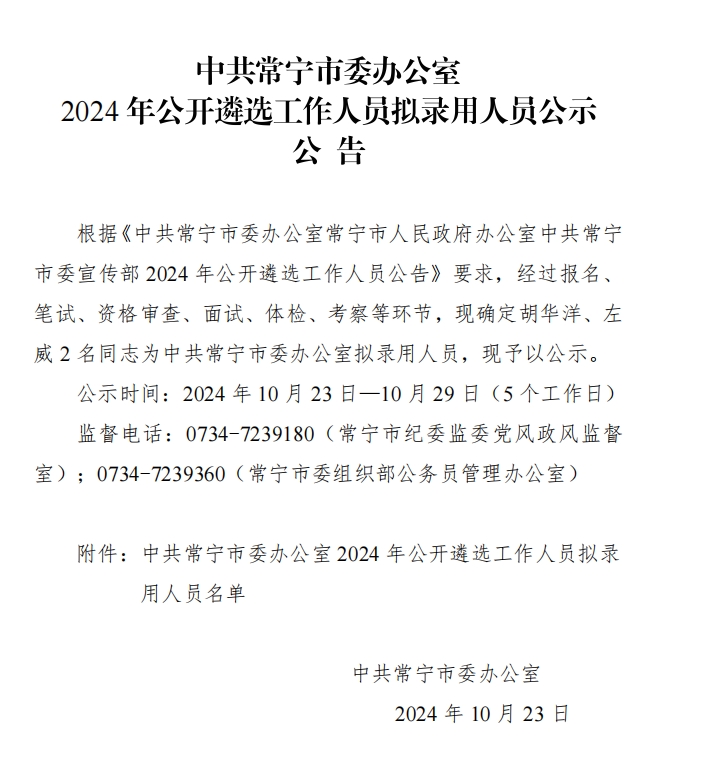 中共常寧市委辦公室2024年公開(kāi)遴選工作人員擬錄用人員公示公告