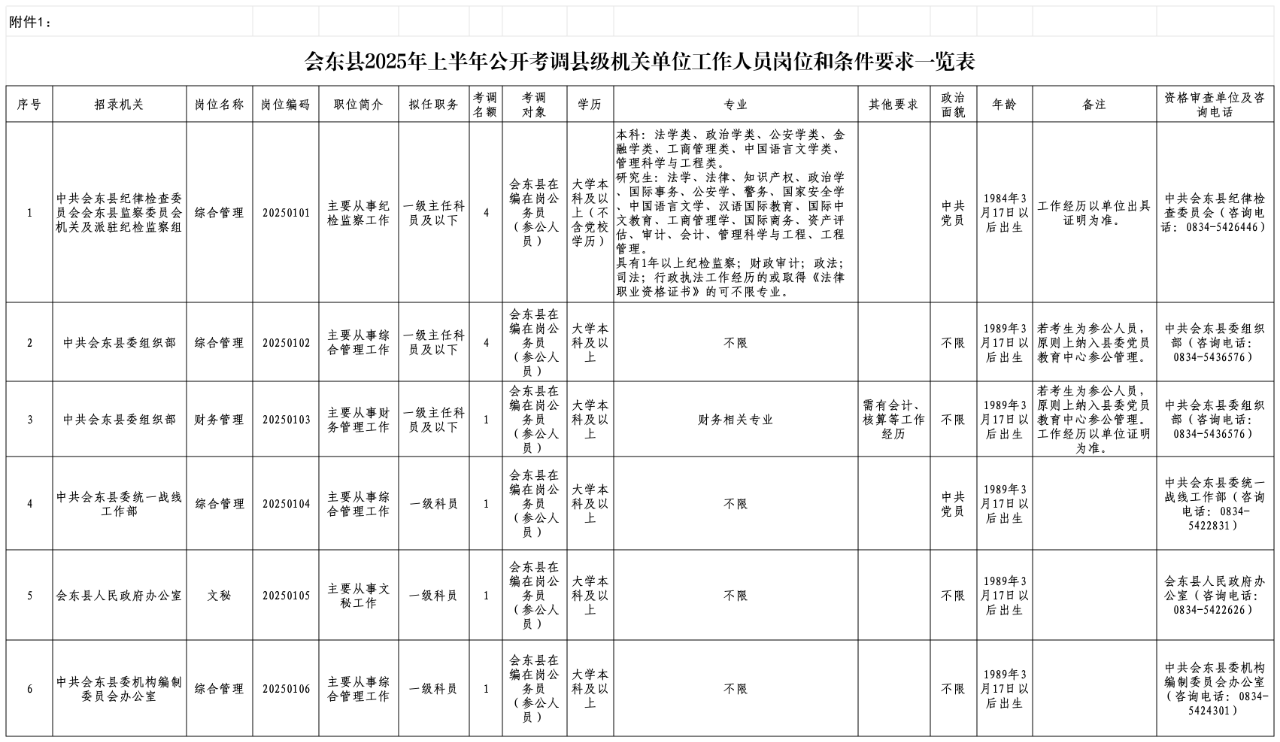 附件:1.會東縣2025年上半年公開考調(diào)縣級機(jī)關(guān)單位工作人員崗位和條件要求一覽表