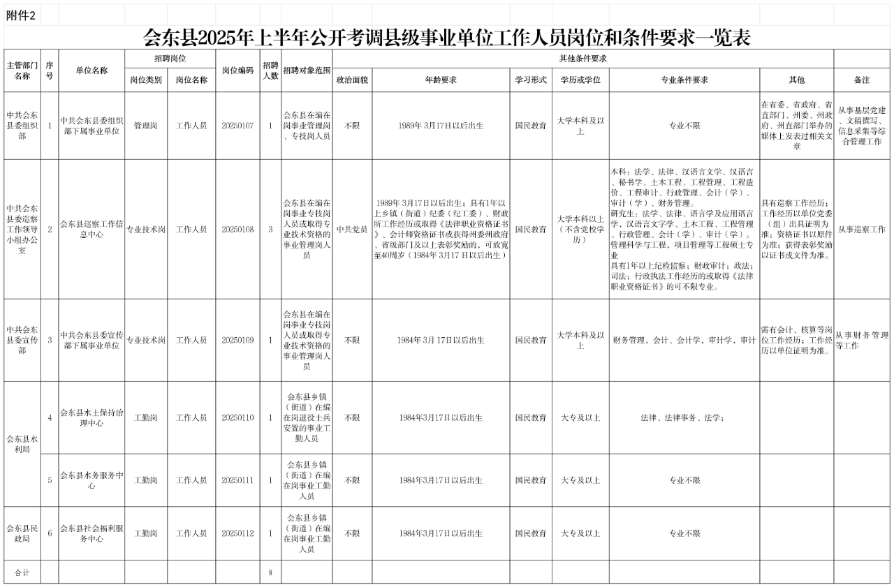 2.會東縣2025年上半年公開考調(diào)縣級事業(yè)單位工作人員崗位和條件要求一覽表
