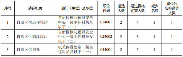 寧夏回族自治區(qū)2025年區(qū)直機(jī)關(guān)公開遴選公務(wù)員報(bào)名及資格初審工作結(jié)束后,有部分職位未達(dá)到筆試開考比例。根據(jù)《寧夏回族自治區(qū)公務(wù)員公開遴選實(shí)施辦法》《寧夏回族自治區(qū)2025年區(qū)直機(jī)關(guān)公開遴選公務(wù)員公告》中“筆試開考比例(職位有效報(bào)名人數(shù)與遴選名額之比)為5:1。對(duì)達(dá)不到開考比例的職位,自治區(qū)公務(wù)員局將減少名額或取消職位;對(duì)一些專業(yè)性強(qiáng)、報(bào)名人員少等特殊職位,可適當(dāng)降低筆試開考比例。被取消職位的報(bào)名人員允許改報(bào)其他職位,改報(bào)只組織實(shí)施1次,具體改報(bào)方式電話通知報(bào)名人員本人”的規(guī)定,經(jīng)研究,決定取消減少部分職位遴選名額、降低部分職位筆試開考比例。具體如下: