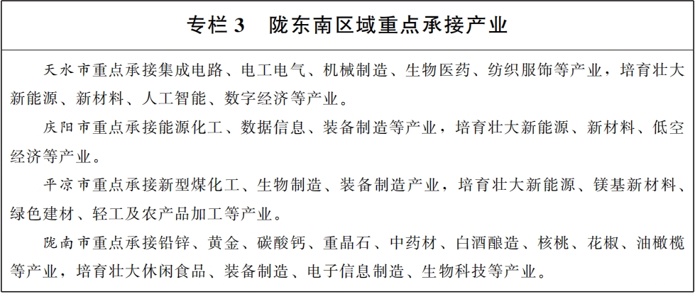 (三)打造隴東南電子信息和能源化工承接區(qū)。隴東南地區(qū)以電子信息制造、電工電氣、能源化工等產(chǎn)業(yè)為重點(diǎn)承接方向,推動(dòng)農(nóng)產(chǎn)品加工等特色產(chǎn)業(yè)轉(zhuǎn)型升級(jí)。
