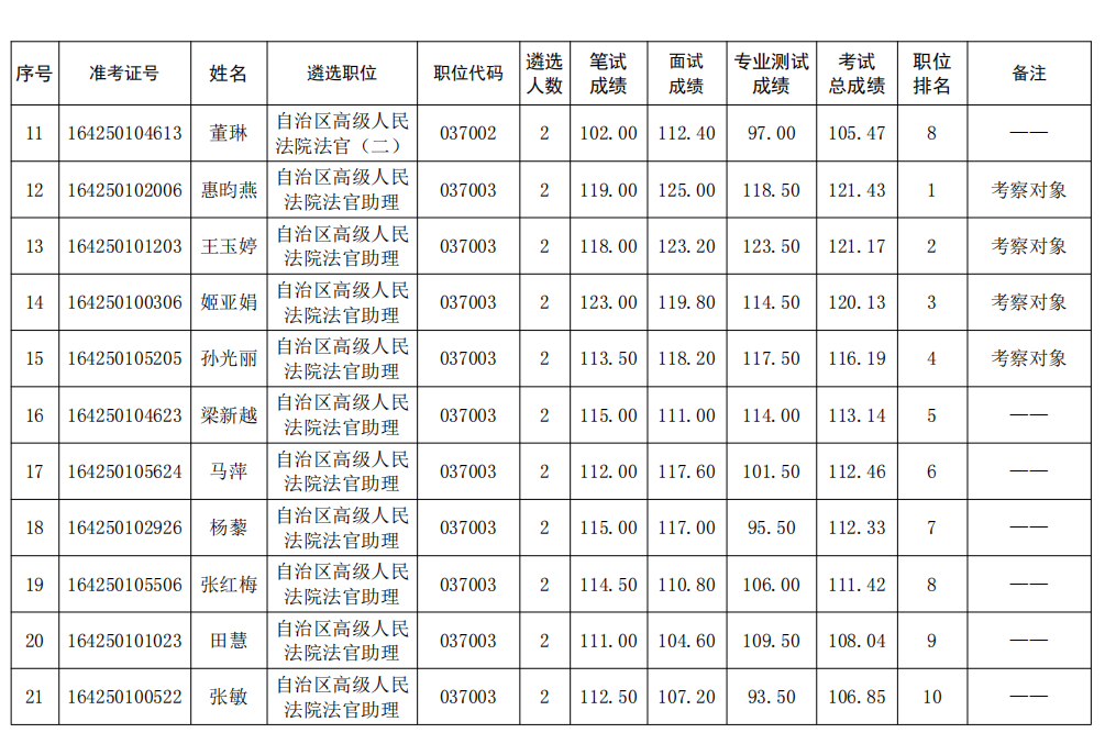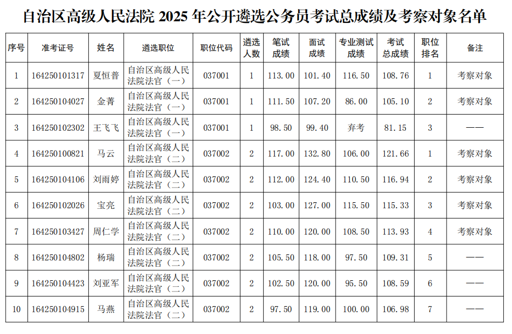 自治區(qū)高級人民法院2025年公開遴選公務員考試總成績及考察對象名單公告